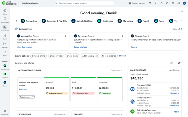 - Invoice and payments: Get paid faster with QuickBooks Payments by accepting credit cards and bank transactions on your invoices. You'll also get helpful reminders and status updates.