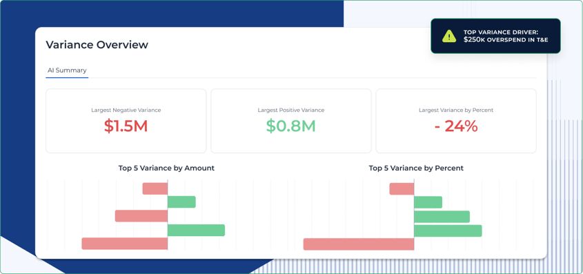 - Smart variance analysis: Highlights material variances (budget vs. actuals, MoM, YoY) and suggests likely drivers based on patterns in your historical data.